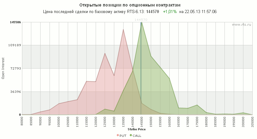 На графике открытого интереса по опционным контрактам на фьючерс индекса РТС отчетливо выделяются два страйка: 135000 и 145000. По нижнему открыта большая позиция в put-опционах, по верхнему — в call. В настоящий момент мы вплотную подошли к верхней границе этого коридора. Главный вопрос — сможет ли рынок преодолеть её или состоится откат вниз. В случае пробоя можем довольно быстро долететь до 150000 на покупках хеджеров.