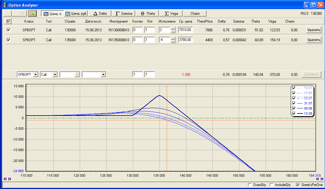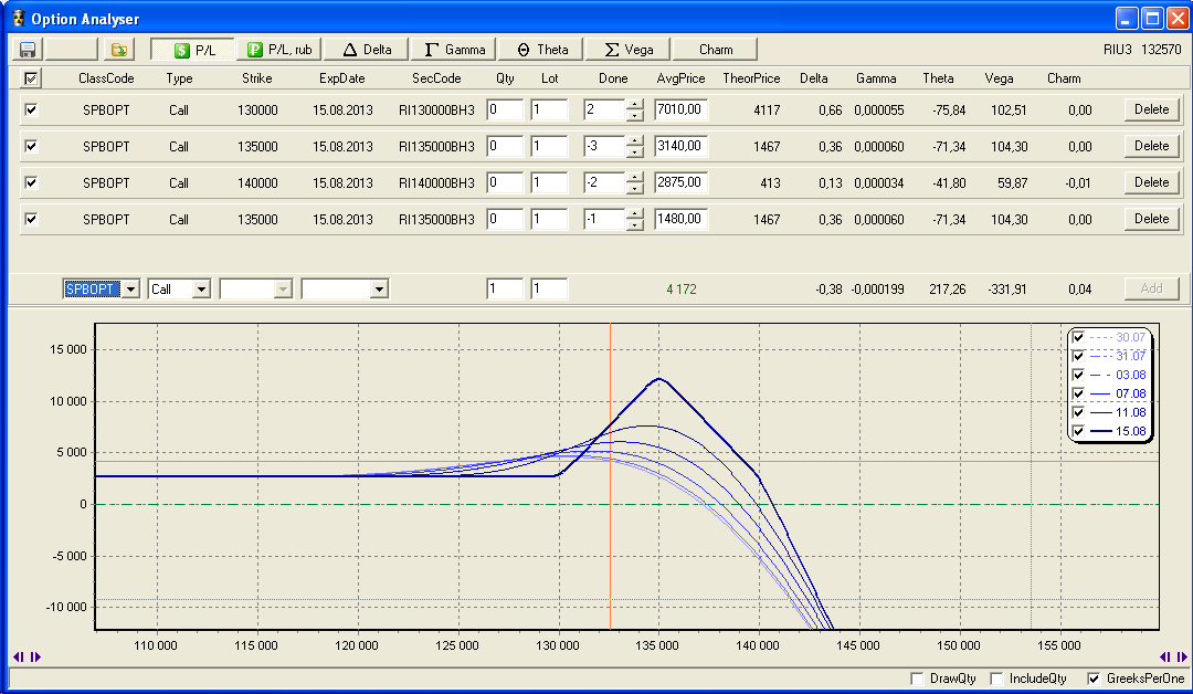 Самый обычный пропорциональный call-спред из опционов на фьючерс РТС: 2 длинных call-а 130000 страйка и 4 коротких call-а 135000 страйка.