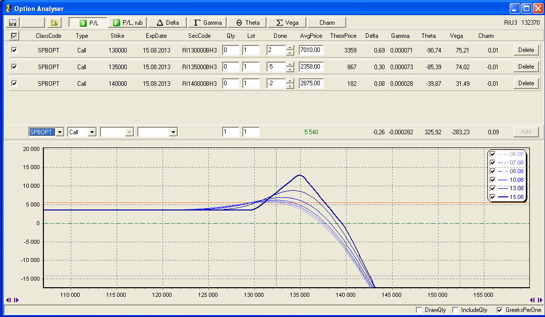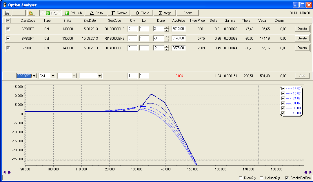 Самый обычный пропорциональный call-спред из опционов на фьючерс РТС: 2 длинных call-а 130000 страйка и 4 коротких call-а 135000 страйка.