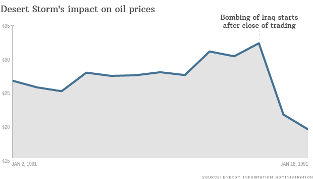 Одно из крупнейших в истории однодневных падений цен на нефть произошло 17 января 1991 года, на следующий день после начала американских бомбардировок в Ираке. В тот день цены упали на 33%, а S&P500 вырос на 3,7%.