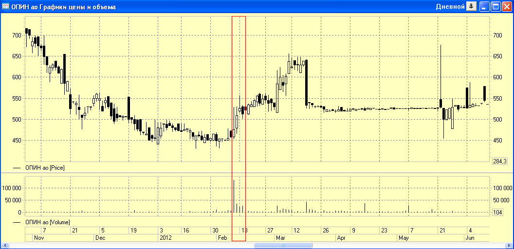 О каких суммах идет речь, Банк России не сообщает. Среднедневной оборот по акциям "ОПИНа" на ММВБ в первые несколько месяцев 2012 года был невелик — порядка 3,5 млн рублей. Однако на протяжении нескольких февральских дней "ОПИН" был очень популярной бумагой, свидетельствует статистика биржи: 9 февраля оборот подскочил до 66 млн рублей (видимо, это и привлекло внимание регулятора), 10 февраля — 18 млн рублей, 13 февраля — 13 млн рублей, 14 февраля — 14 млн рублей.