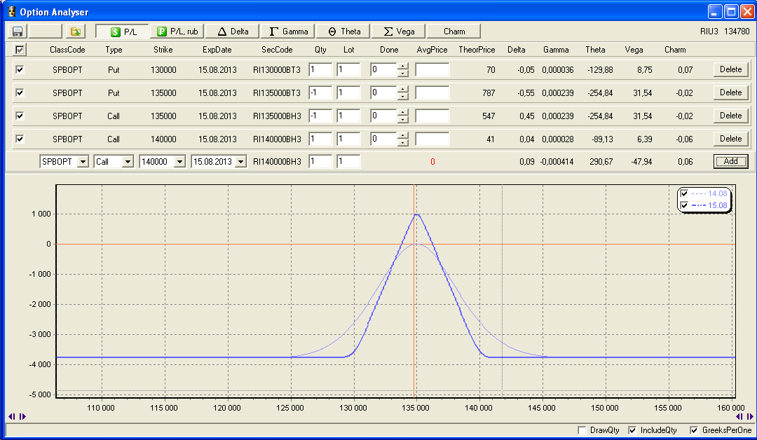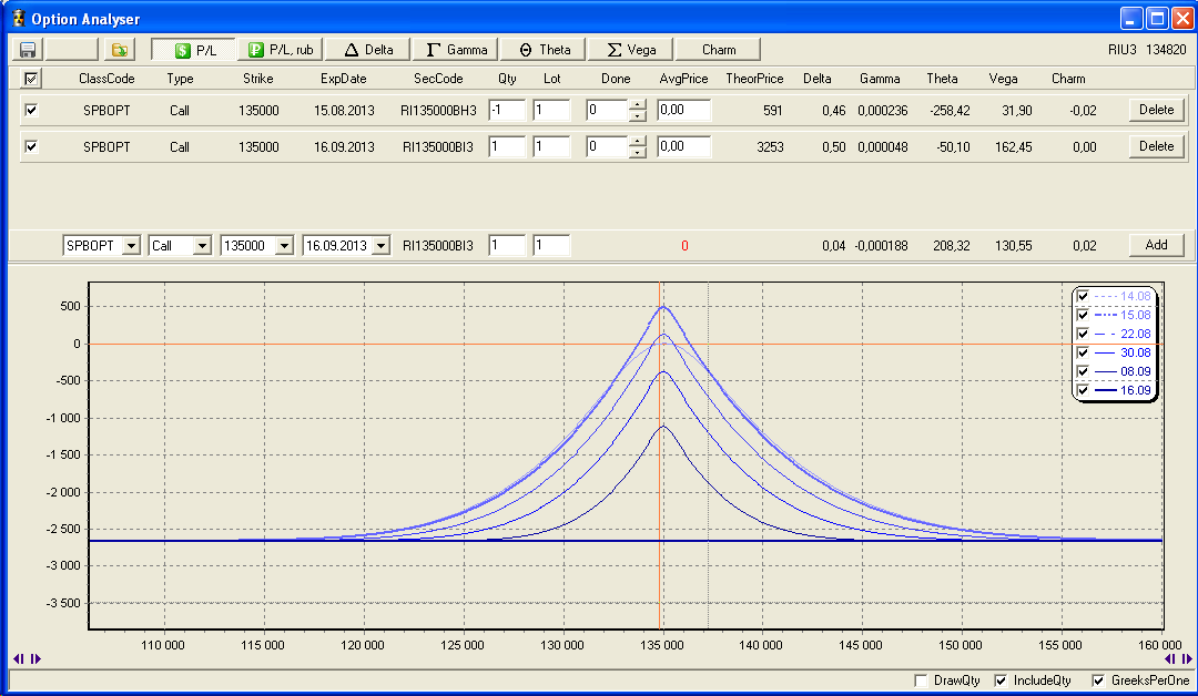 Ниже приведён график прибыли/убытка для простейшего горизонтального (календарного) спреда из опционов за один день до экспирации ближайшего опциона. После того, как августовский опцион прекратит своё существование, останется лишь купленный сентябрьский, профиль доходности которого есть во всех учебниках. Увеличится или уменьшится значение максимально возможного убытка для оставшегося опциона будет зависеть от цены экспирации августовского опциона.