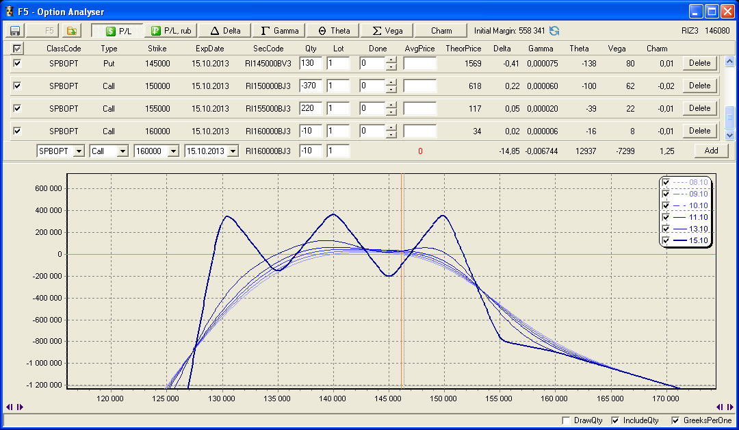 Позиционная торговля опционами тоже довольно широко представлена на конкурсе. И хотя придумать что-то новое в этом классе стратегий довольно сложно, порой встречаются очень необычные по своему профилю доходности позиции. К примеру, позиция участника Carlos: Основные греки данной позиции неплохо сбалансированы. Соотношение риска и доходности, на мой взгляд, тоже разумное. Но, как всегда при работе с опционами, определяющее значение имеет управление позицией, а не её статичный профиль.