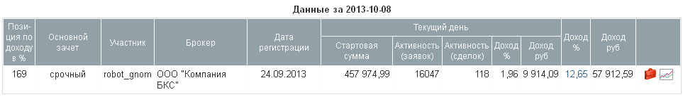 Честь опционных роботов в этом году защищают robot_gnom и robot_WaterMelon. Оба придерживаются дельта-вега-нейтральных стратегий. Но первый старается не зарываться в позицию и задействовать минимальное ГО, что позволяет удерживать межсессионные риски на очень низком уровне, и при этом показывать более высокую доходность в процентном отношении. Зато второй котирует практически весь диапазон страйков трёх ближайших серий индексных опционов, то есть практически все торгующиеся в данный момент страйки. Кроме того, robot_WaterMelon столь же активно работает с опционами на фьючерс доллар США-рубль. Примечателен ещё один момент: robot_gnom выставляет огромное количество заявок (в несколько раз больше чем robot_WaterMelon), но из этого количества до сделки доходит менее 1%, при том что у второго робота эта величина достигает 50%. Если я что-то упустил или обделил кого-нибудь вниманием — милости прошу в комментарии, будем исправлять