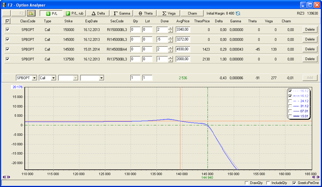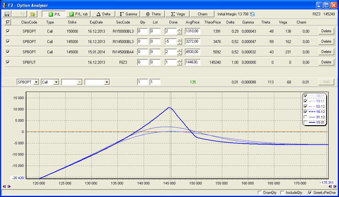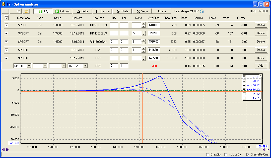 Не за горами новый год, а значит фондовый рынок в предвкушении традиционного ралли Санта Клауса. Несмотря на затяжной рост западных фондовых индексов, ожидать более-менее серьёзную коррекцию можно только после объявления об отключении печатного станка дяди Бена, неустанно снабжающего рынки халявными деньгами. И хотя дядя Бен уже почти канул в лету, на смену ему идёт тётя Джанет, которая вряд ли отважится отключить взбесившийся печатный станок сразу после своего назначения на пост председателя ФРС. Короче, ситуация на рынке на мой взгляд такова: хочется шортить, но нельзя; надо бы расти, но нет сил. Поэтому сформируем ленивую календарную позицию в расчёте на то, что рынки далеко не уйдут от нынешних уровней. А ленивую потому, что гамма и вега относительно теты малы, что даст возможность увеличить интервал хеджирования и уменьшить его частоту.