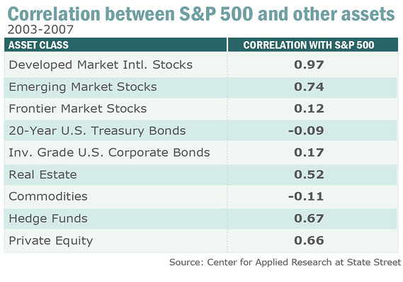 С 2003 по 2007 годы commodities (сырьё, драгметаллы) и 20-летние казначейские облигации США были единственными классами активов, которые имели отрицательную корреляцию с фондовым индексом S&P 500. Так называемые пограничные рынки (frontier markets) и корпоративные облигации США демонстрировали небольшую положительную корреляцию, обеспечивая некоторую диверсификацию.