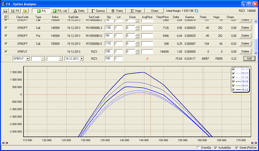 Позиционная торговля опционами тоже довольно широко представлена на конкурсе. И хотя придумать что-то новое в этом классе стратегий довольно сложно, порой встречаются очень необычные по своему профилю доходности позиции. К примеру, позиция участника Carlos: Основные греки данной позиции неплохо сбалансированы. Соотношение риска и доходности, на мой взгляд, тоже разумное. Но, как всегда при работе с опционами, определяющее значение имеет управление позицией, а не её статичный профиль.