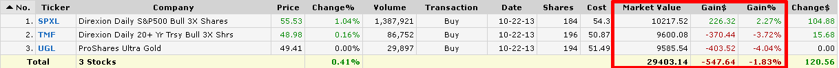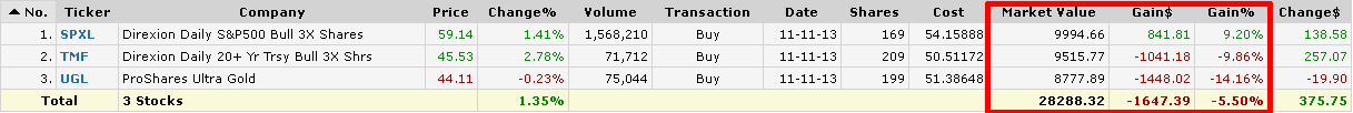 Из-за обвала золота в портфеле снова образовался заметный перекос, который было принято решение устранить путём продажи 10 SPXL (акции) и покупки 14 UGL (золото). Ребалансировка была проведена с дебетом, поэтому из кэша было взято дополнительно $26,14, теперь там осталось $38,15.