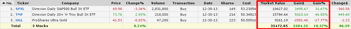 В процессе управления были некоторые огрехи, в частности, ребалансировка производилась значительно реже, чем хотелось бы. Но это было обусловлено безудержным ростом рынка акций, и практически полным отсутствием заметных коррекций на нём. Кроме того, золото (фонд UGL), включенное в портфель с целью диверсификации, практически утратило свою хеджирующую роль и безыдейно болталось на месте большую часть времени, то есть ожидаемой от него отрицательной корреляции с рынком акций не получилось.