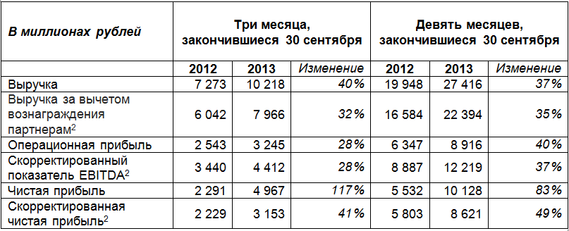 Крупнейший российский интернет-поисковик Яндекс резко увеличил квартальные финансовые показатели и сообщил, что ожидает роста выручки за год у верхней границы прежнего прогноза — 34-38 процентов. Чистая прибыль Яндекса выросла на 117% в годовом выражении до 5,0 миллиардов рублей, скорректированная с учетом продажи 75% сервиса Яндекс.Деньги Сбербанку в июле 2013 года — выросла на 41 процент до 3,2 миллиарда рублей. Выручка увеличилась на 40% до 10,2 миллиарда рублей, показатель прибыли EBITDA — на 28% до 4,4 миллиарда рублей, сообщила компания в четверг.