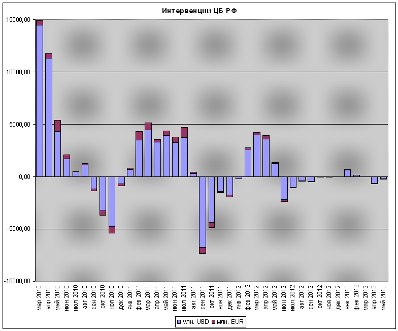 Центробанк РФ выступал продавцом валюты в мае 2013 года, продав $236,81 миллиона и 18,65 миллиона евро на внутреннем рынке.